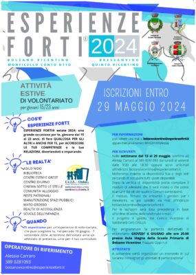 Il Progetto ESPERIENZE FORTI è realizzato dal Centro Vicentino di Solidarietà CeIS ONLUS, prevede una proposta di volontariato in realtà sociali, ricreative, culturali e ambientali, da rivolgere ai GIOVANI dai 15 ai 23 ANNI NEL PERIODO ESTIVO, da giugno a settembre.